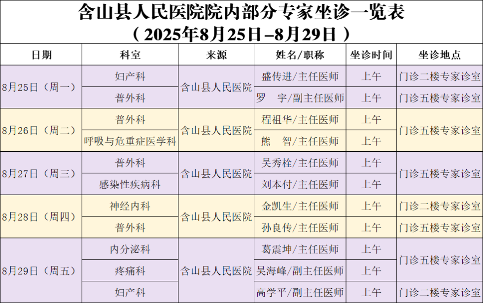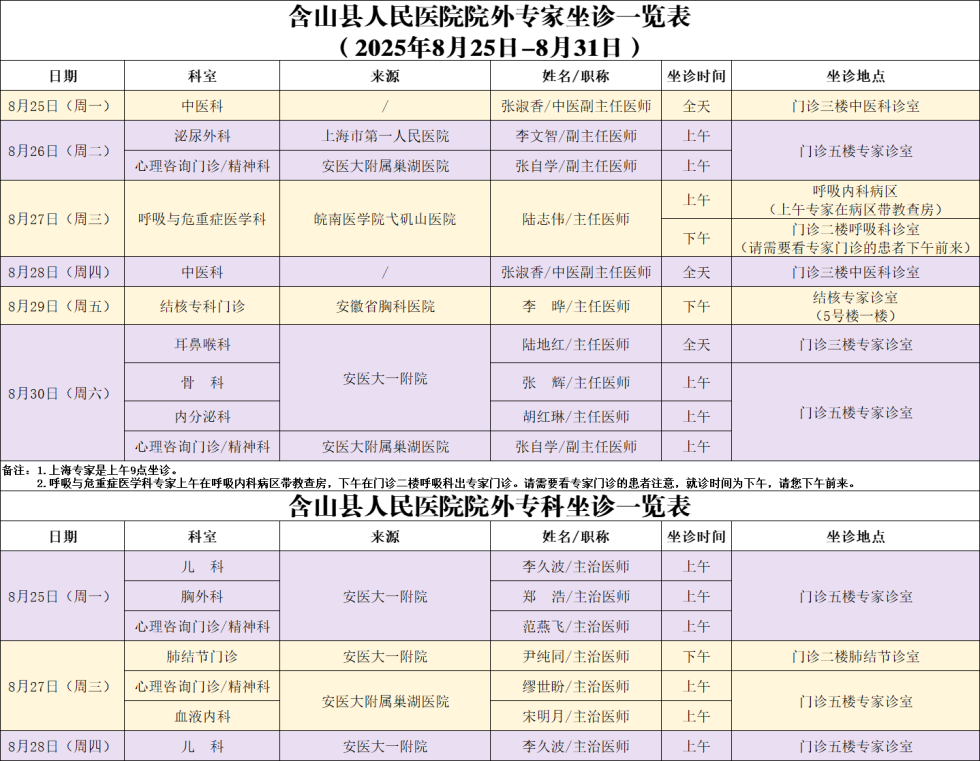 院内外专家专科坐诊信息(2025年8月25日—8月31日)
