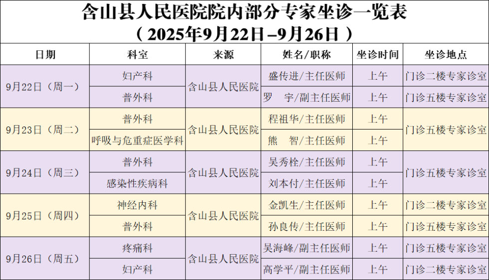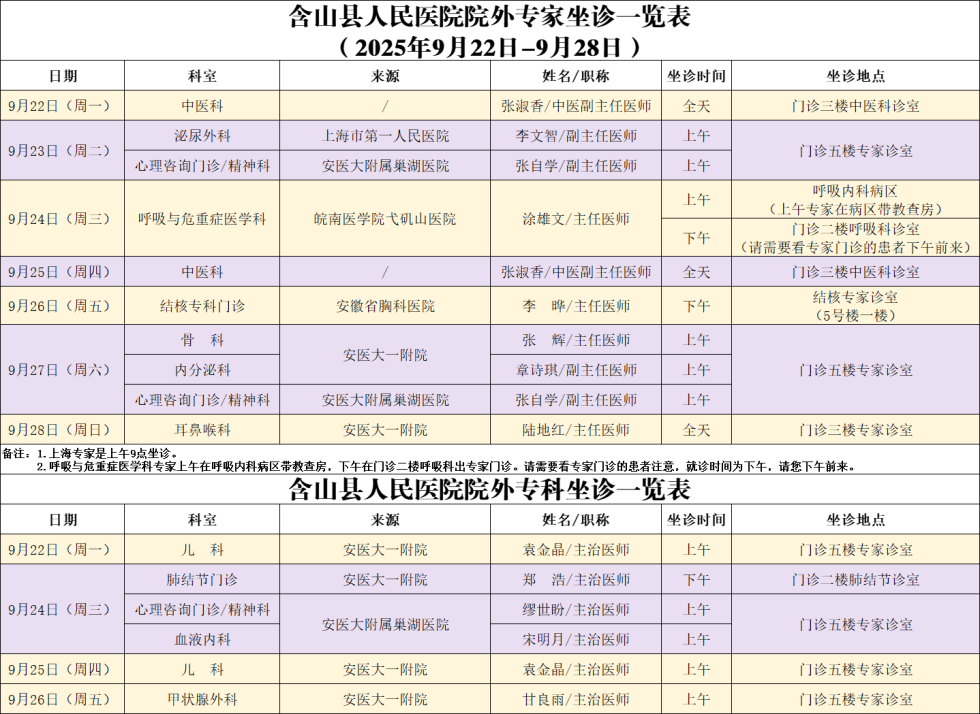 院内外专家专科坐诊信息(2025年9月22日—9月28日)