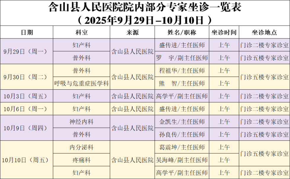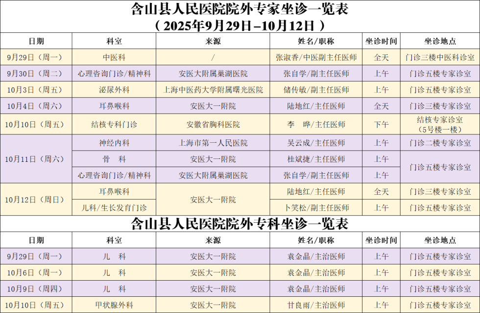 院内外专家专科坐诊信息(2025年9月29日—10月12日)