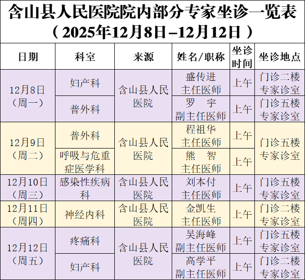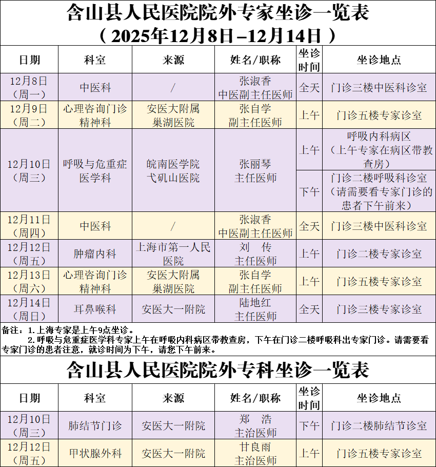 院内外专家专科坐诊信息(2025年12月8日—12月14日)
