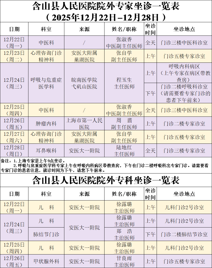 院内外专家专科坐诊信息(2025年12月22日—12月28日)