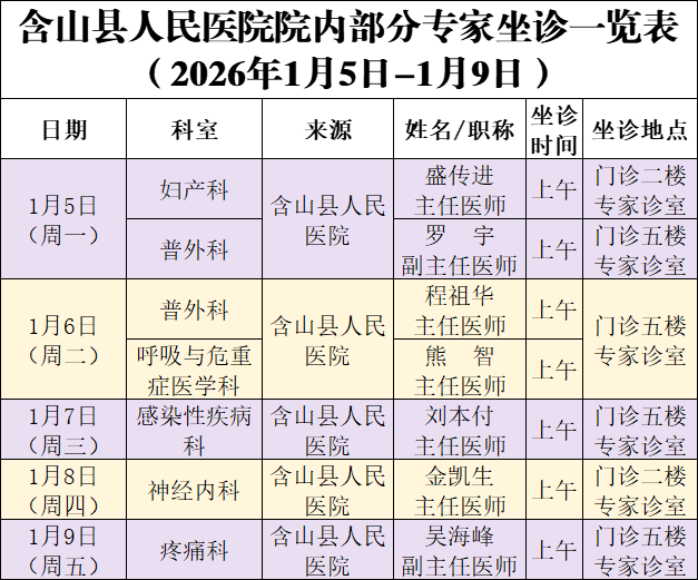 院内外专家专科坐诊信息(2026年1月5日—1月11日)