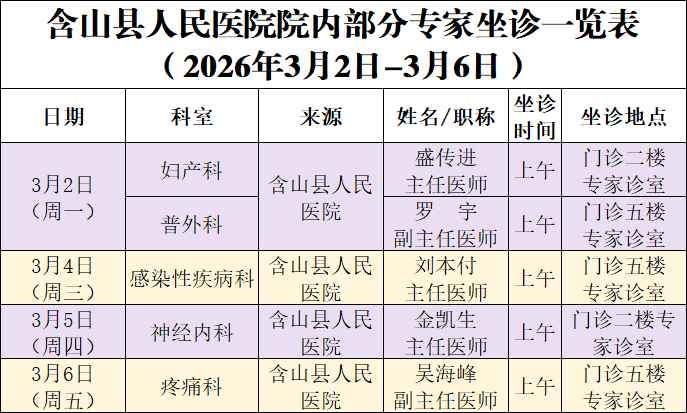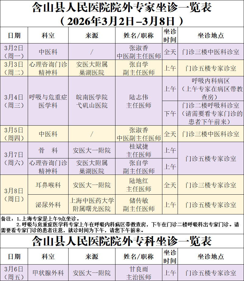 院内外专家专科坐诊信息(2026年3月2日—3月8日)