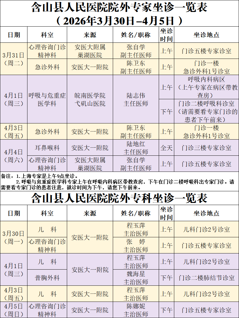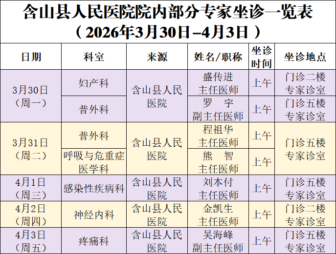 院内外专家专科坐诊信息(2026年3月30日-4月5日)