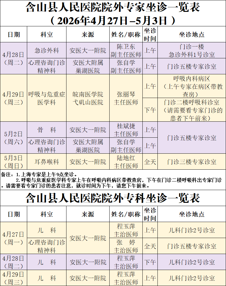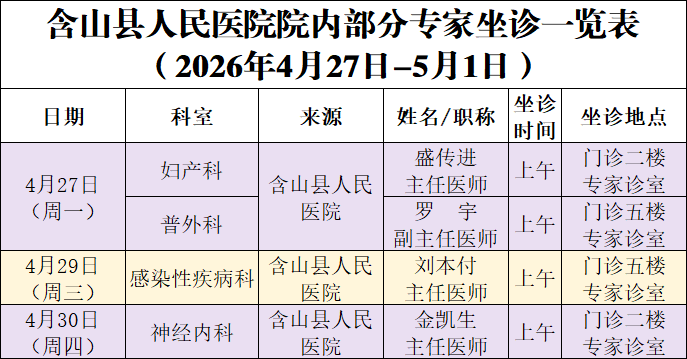 【名医上马】院内外专家专科坐诊信息(2026年4月27日—5月3日)